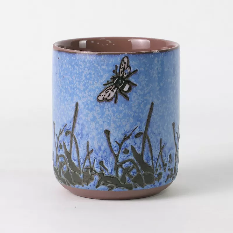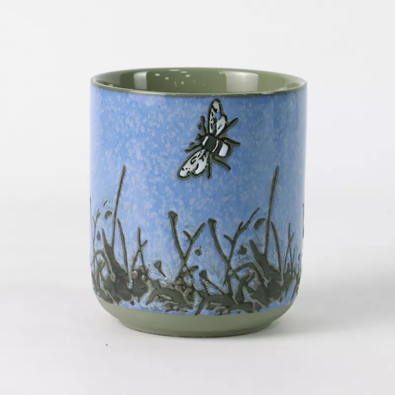 Böcek Desenli Seramik Mumluk serisi, klasik Doğu estetiğinin özünü ve yıldızlı gökyüzünün mistik güzelliğini yakalayan "Kordiseps simbiyozunun" doğal görüntüsünden ilham alıyor. Yüksek sıcaklıkta fırında pişirilen cilayı elle boyanmış sır altı dekorasyonuyla harmanlıyor, düzinelerce ayarlama ve iyileştirmeden geçerek sonuçta üç imza rengi yaratıyor: Yıldızlı Gece Mavisi, Mistik Yeşil ve Derin İndigo. Fincanın dış duvarı, sanki Samanyolu'nun parlaklığı avucunuzun içinde tutuluyormuş gibi, ince altın beneklerle serpilmiş uçsuz bucaksız yıldızlı bir gökyüzünü andırıyor; İç duvarda ayna gibi berrak, saf bir cila kullanılmış, dışarıdaki yıldızlı gökyüzü dokusuyla güçlü bir görsel kontrast yaratılmış, ışık ve gölge etkileşimindeki ustalık sergilenmiştir. Deneyimli zanaatkarlar tarafından titizlikle işlenen, alt kısımdaki elle boyanmış kelebek, çim sapı ve karahindiba desenleri canlı ve canlıdır, adeta yaşamın döngüsünün ve doğanın ortakyaşamının sonsuz bir öyküsünü anlatır. Her fincan, doğaya saygıyı ve yaşamı kutlamayı temsil eden eşsiz bir sanat eseridir.