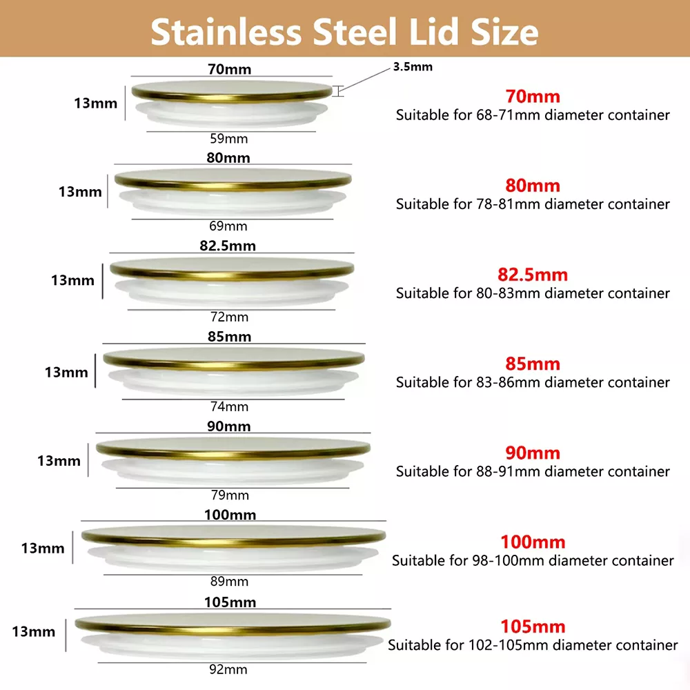 Bu paslanmaz çelik mum kavanoz kapakları, en yaygın mum kavanoz açıklıklarına uyacak şekilde tasarlanmıştır. Sadece kavanozu etkili bir şekilde mühürlemek ve kokuya kilitlemekle kalmazlar, aynı zamanda genel ambalajın şık ve kişiselleştirilmiş hissini anında geliştirirler. Bir ev ortamında (oturma odanızı dekore etmek ve en sevdiğiniz kokuyu yaymak gibi) veya güzel markalı bir hediye setine dahil edilmek gibi, çekirdek pratikliği, olumlu sürdürülebilirliği ve gençlik dostu, kişisel bir ifadeyi başarıyla birleştirirler.