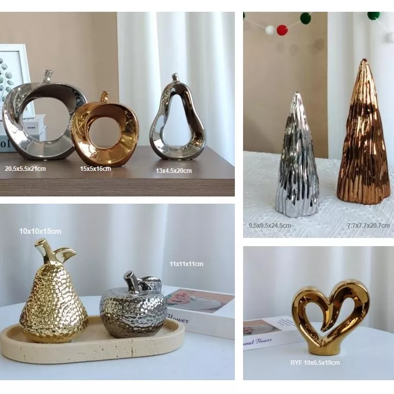 Byf'nin özel seramik dekorları meyve, Noel ağaçları ve kalplere sahiptir. Seramikten yapılmış, altın ve gümüşte bulunan metalik bir parlaklık oluşturmak için benzersiz bir teknik kullanırlar. Meyve tasarımları (elma ve armut) benzersiz kesikler ve dokularla pürüzsüz çizgiler içerir; Noel ağacı, zengin dokularla üç boyutludur; Ve kalp basit ve zarif, bir romantizm dokunuşu veriyor. Bu zarif, hafif lüks parçalar, oturma odanız veya masanız için mükemmeldir, evinize sanatsal yetenek ve stil dokunuşu ekler. Herhangi bir alanın ambiyansını geliştiren rafine aksesuarlardır.